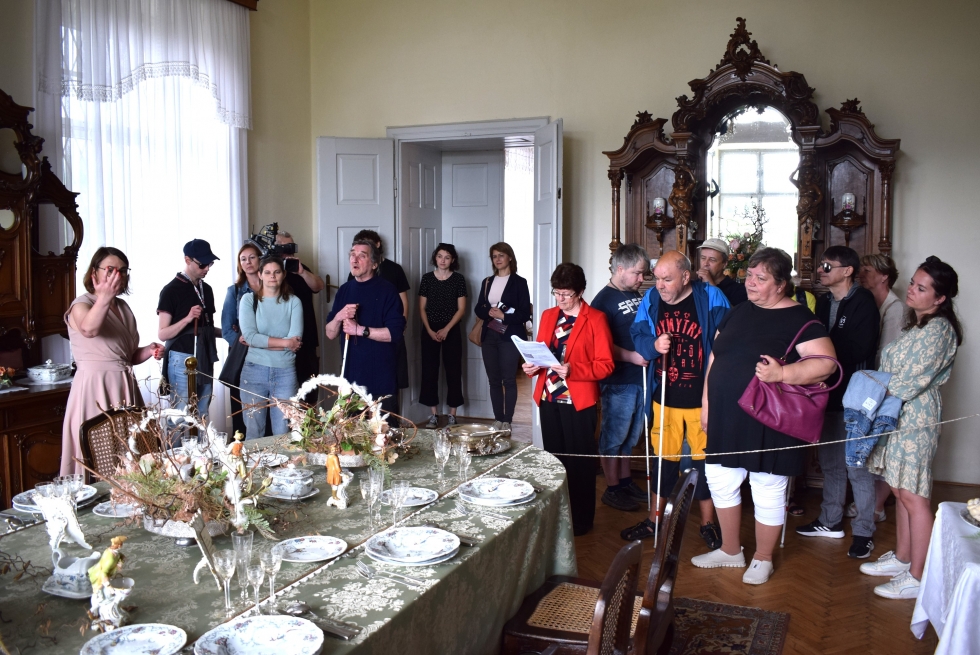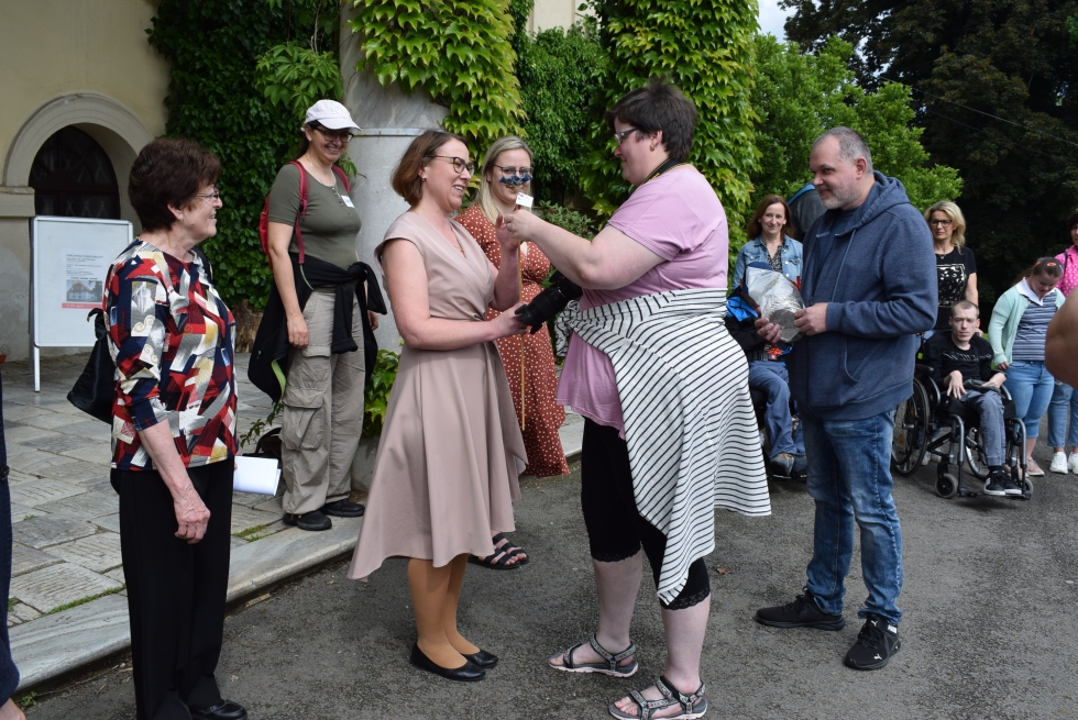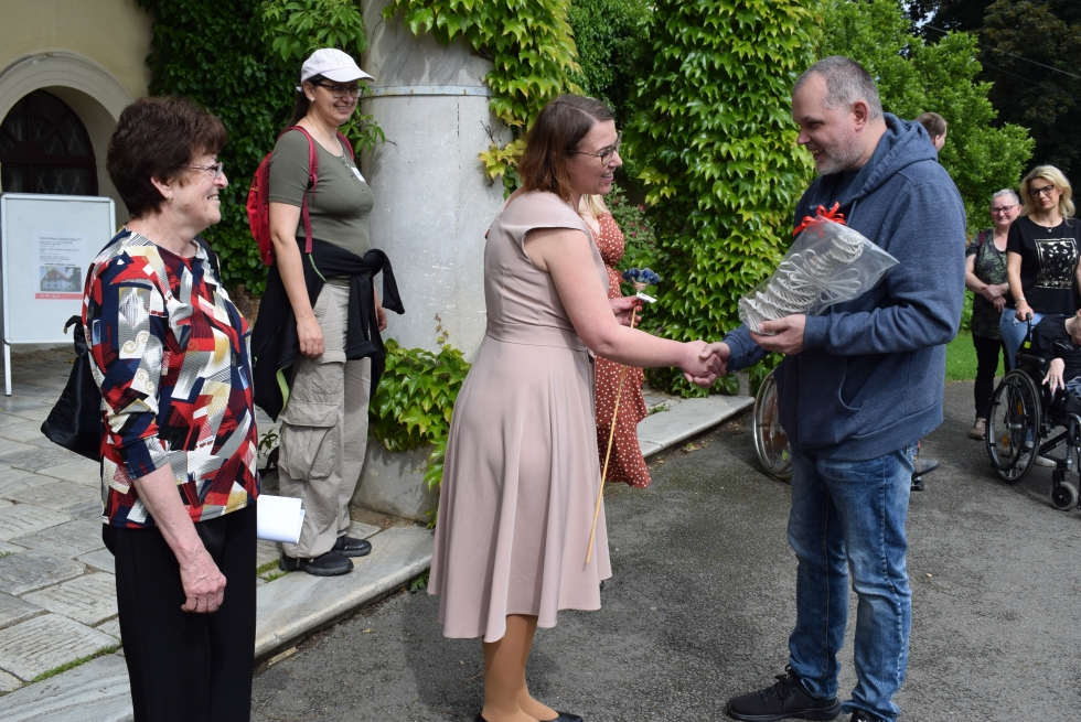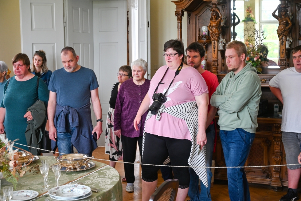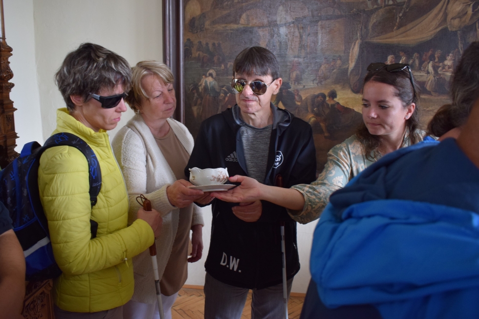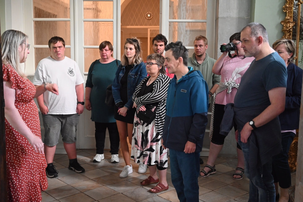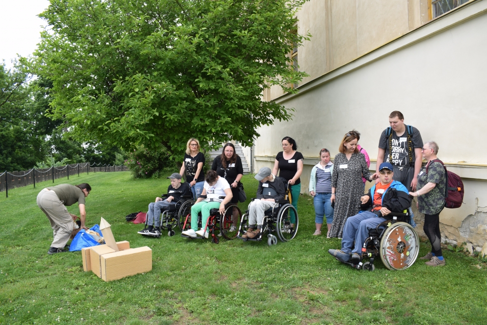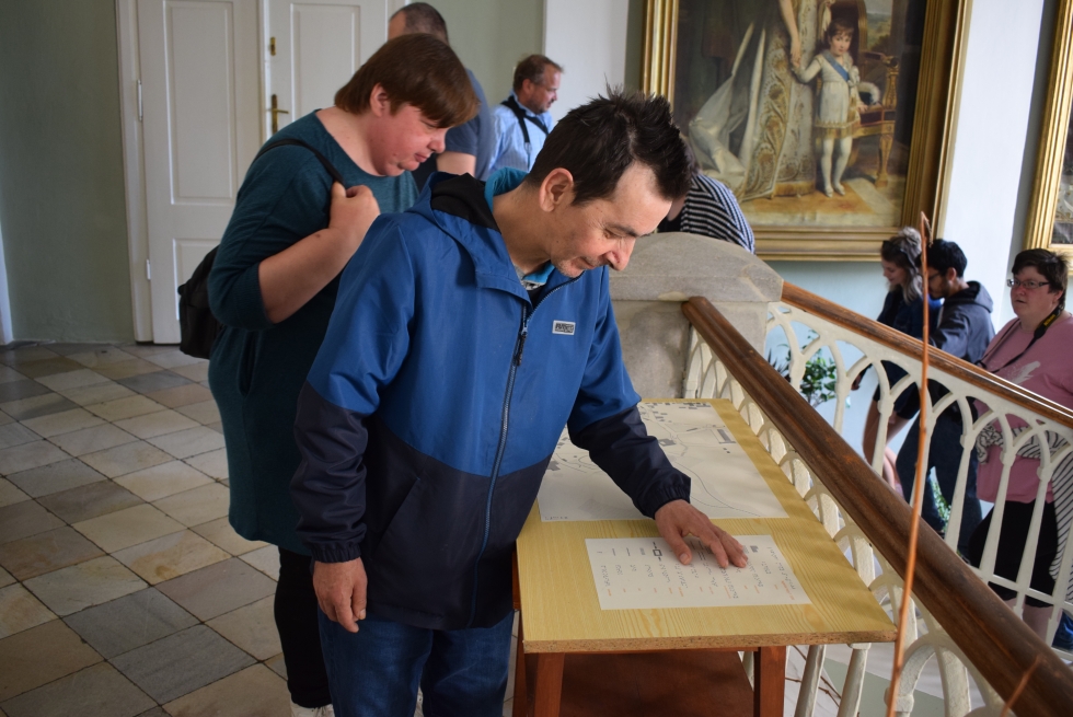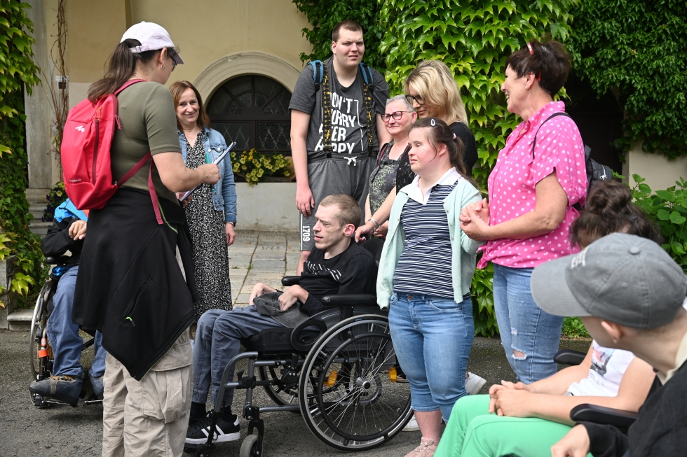 Klienty Mravenečku, Spojky, Vlaštovky, Denního stacionáře pro seniory a Radosti ráno přivítala kastelánka Markéta před zámkem, kde si je průvodkyně rozdělily do tří skupin podle jednotlivých handicapů. Mravenečky si vzala na starost Hanka Vlková. A protože zámek není bezbariérový, nachystala jim originální prohlídku zámeckého okolí zaměřenou tentokrát na zvěř, která v dobách dávných i nedávných žila na zámku i kolem něj. Kastelánka Markéta zase provedla zámkem skupinu lidí se zrakovým handicapem. Během prohlídky si klienti mohli vyslechnout nejen popis jednotlivých komnat a místností zámku, ale také si výjimečně některé z exponátů osahat. „Samotné vyprávění nestačí, je třeba další podnět, a proto je výborné, že jsme si na různé předměty mohli sáhnout, člověk se pak lépe dostane do obrazu,“ pochvaloval si netradiční prohlídku nevidomý klient Spojky pan Daniel.