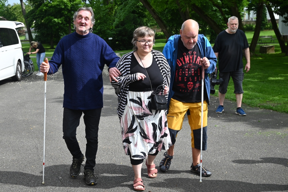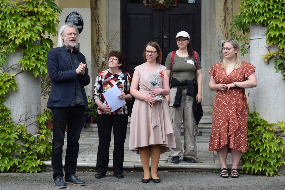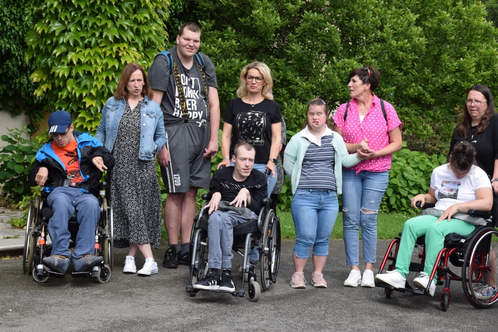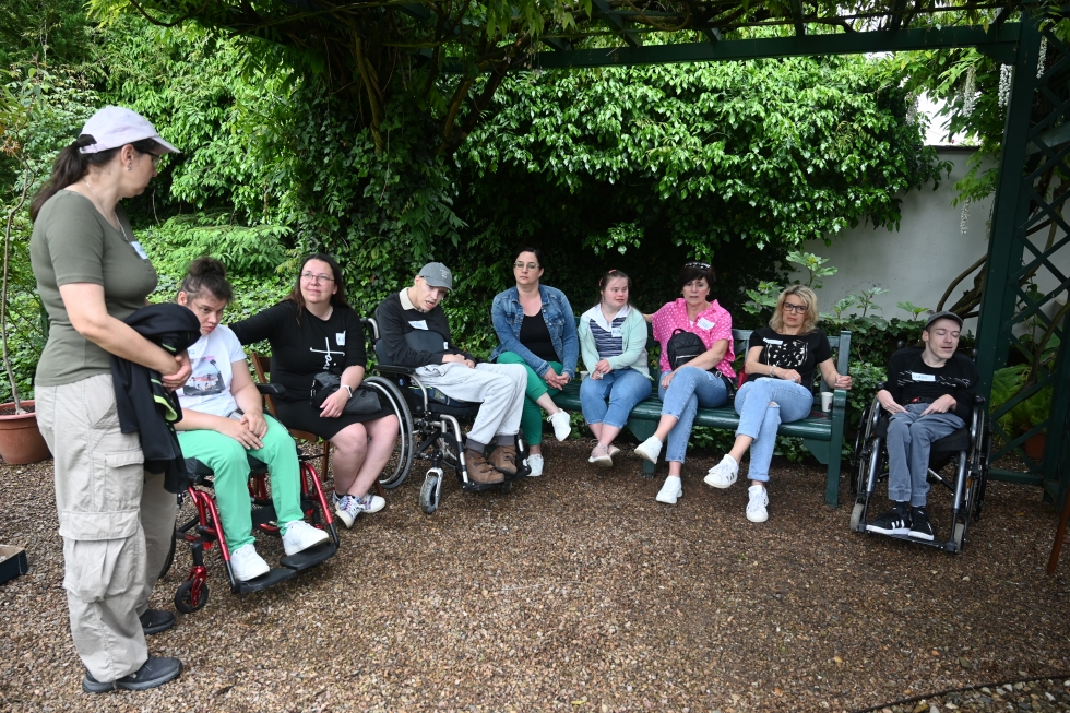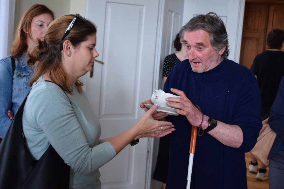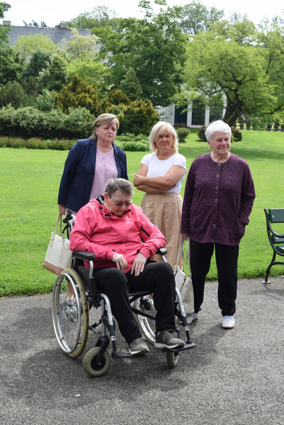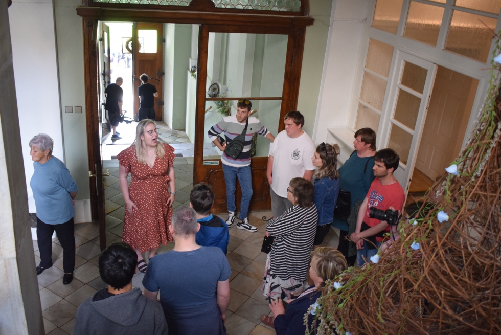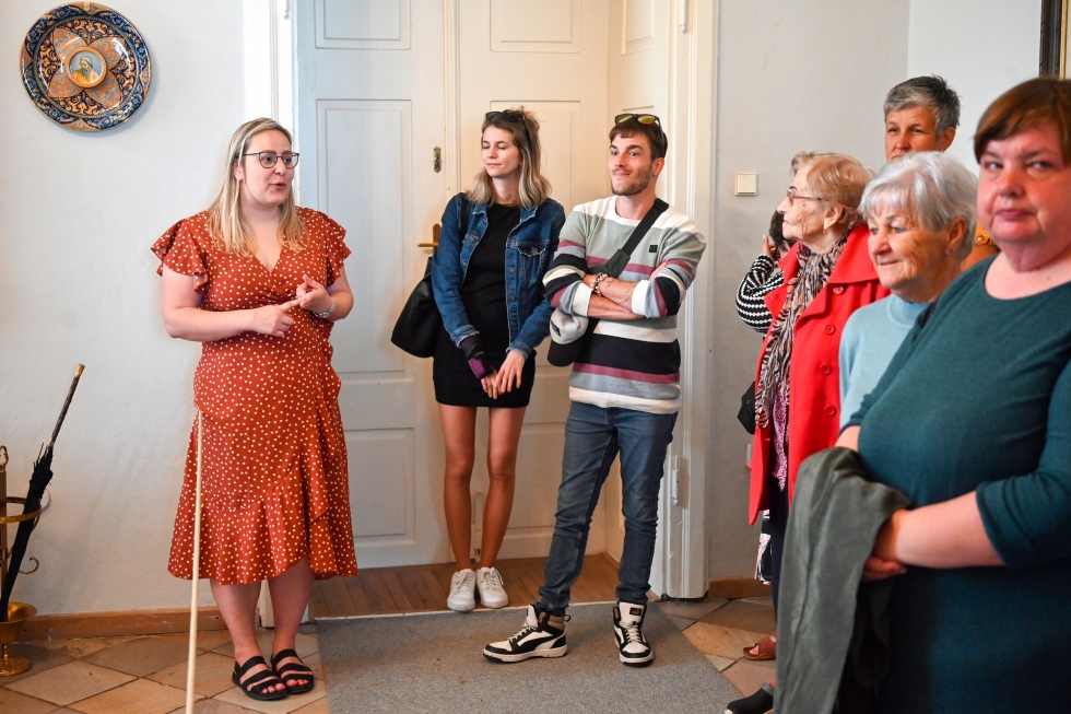 Klienty Mravenečku, Spojky, Vlaštovky, Denního stacionáře pro seniory a Radosti ráno přivítala kastelánka Markéta před zámkem, kde si je průvodkyně rozdělily do tří skupin podle jednotlivých handicapů. Mravenečky si vzala na starost Hanka Vlková. A protože zámek není bezbariérový, nachystala jim originální prohlídku zámeckého okolí zaměřenou tentokrát na zvěř, která v dobách dávných i nedávných žila na zámku i kolem něj. Kastelánka Markéta zase provedla zámkem skupinu lidí se zrakovým handicapem. Během prohlídky si klienti mohli vyslechnout nejen popis jednotlivých komnat a místností zámku, ale také si výjimečně některé z exponátů osahat. „Samotné vyprávění nestačí, je třeba další podnět, a proto je výborné, že jsme si na různé předměty mohli sáhnout, člověk se pak lépe dostane do obrazu,“ pochvaloval si netradiční prohlídku nevidomý klient Spojky pan Daniel.