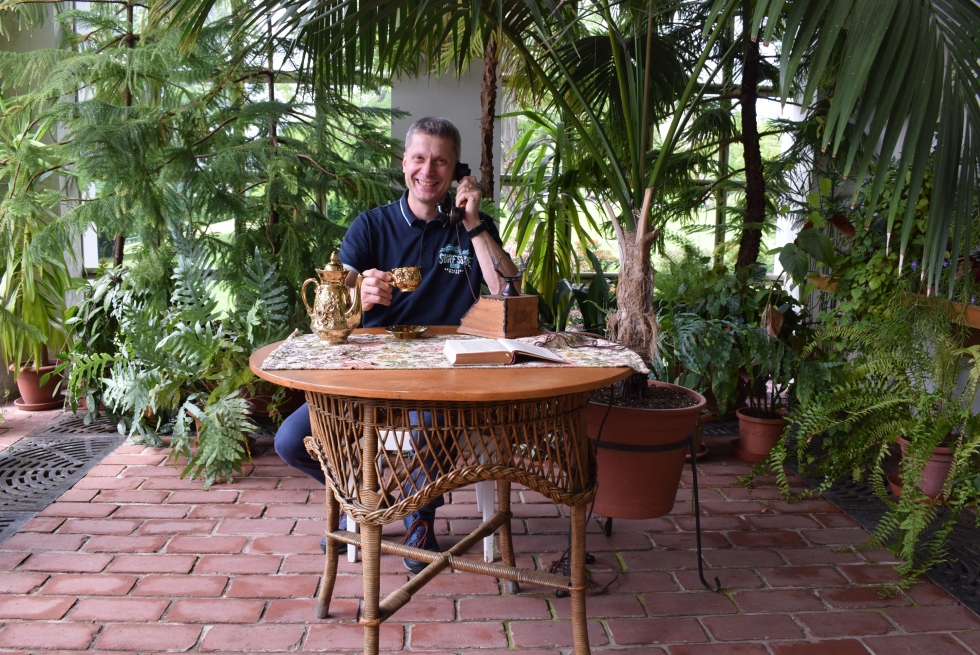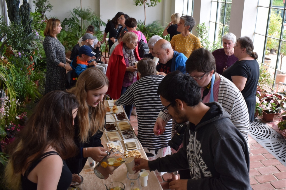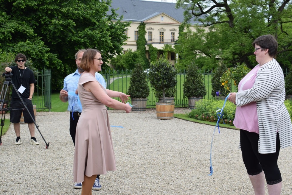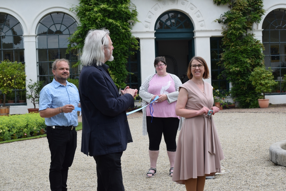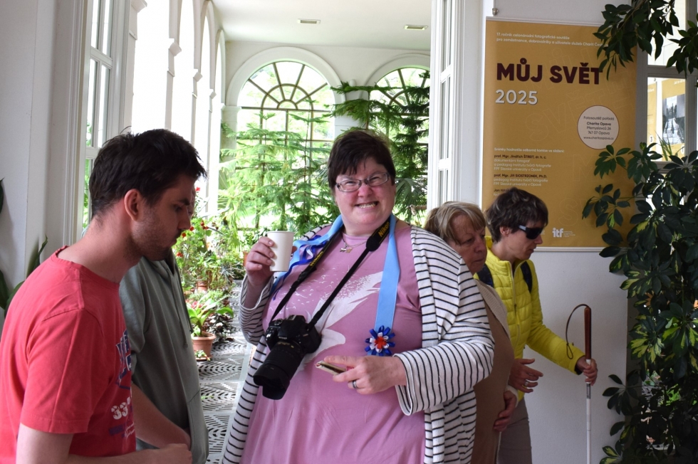 V nedaleké oranžerii pak klienti otevřeli výstavu Můj svět, která zde bude ke shlédnuté až do konce srpna, tedy téměř po celou dobu zámecké sezóny. „Loni ji zde viděly dva a půl tisíce návštěvníků, děkujeme za to, že ji tady můžeme mít,“ sdělila kastelánka, která výstavu zahájila přestřižením vstupní pásky. Tu z obou stran symbolicky drželi klientka Radosti Jana Hertlová a vedoucí dřevařské dílny Radosti Petr Kubesa. Oba tento den nebyli jen návštěvníky Dne Charity Opava na zámku v Raduni, ale jsou zároveň autoři oceněných fotografií, které zde budou vystaveny.