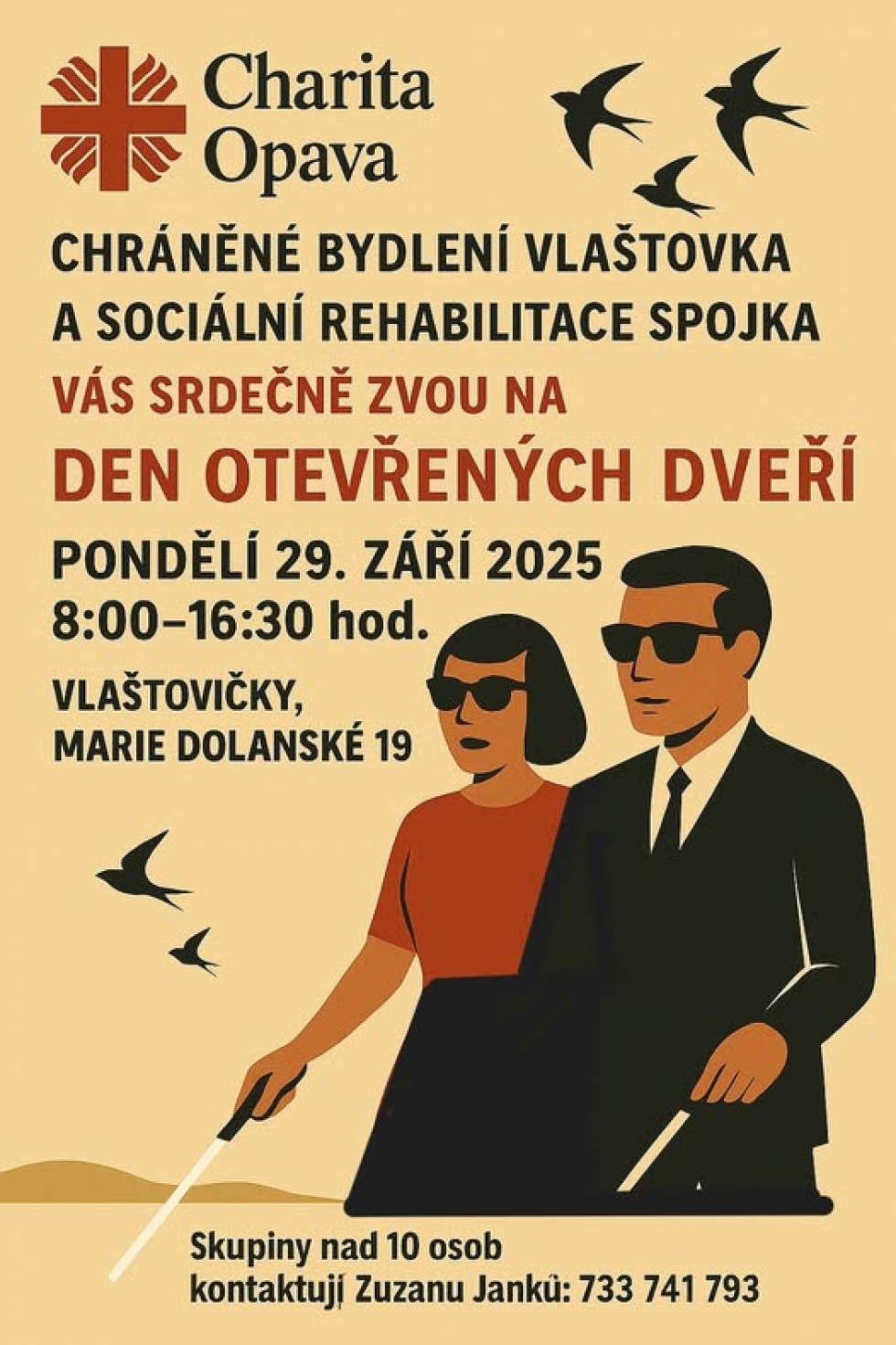 Vlaštovka a Spojka slouží jako chráněné bydlení a sociální rehabilitace lidem s těžkým zrakovým postižením nebo lehkým mentálním znevýhodněním. Komentované prohlídky budovy bývalého kláštera z roku 1917 budou probíhat od 8.00 do 16.30 hodin a jejich součástí bude ukázka zajímavých kompenzačních pomůcek pro nevidomé a také drobné občerstvení. Větší skupinky nad deset osob, například školní třídy, prosí pořadatelé, aby se přihlásily předem u vedoucí Vlaštovky Zuzany Janků na tel. čísle 733 741 793 či e-mailu janku@charitaopava.cz.