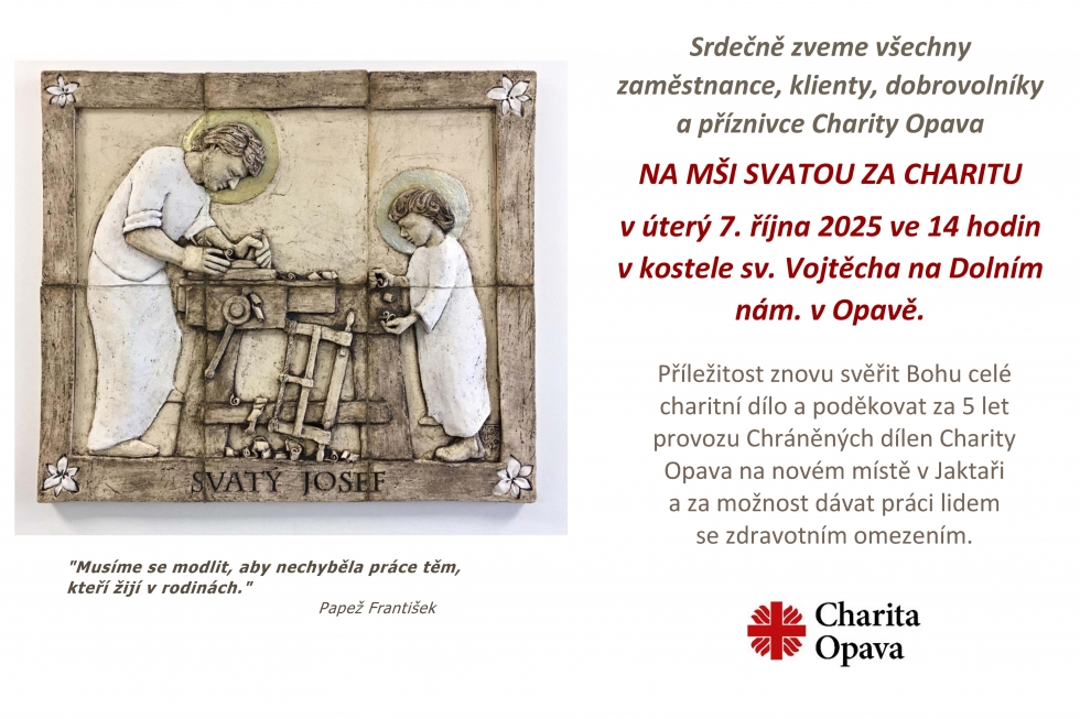 Mše svatá, na které si připomeneme pět let od přestěhování Chráněných dílen Charity Opava do nových prostor v Jaktaři, začíná ve 14 hodin. Všichni jste srdečně zváni.